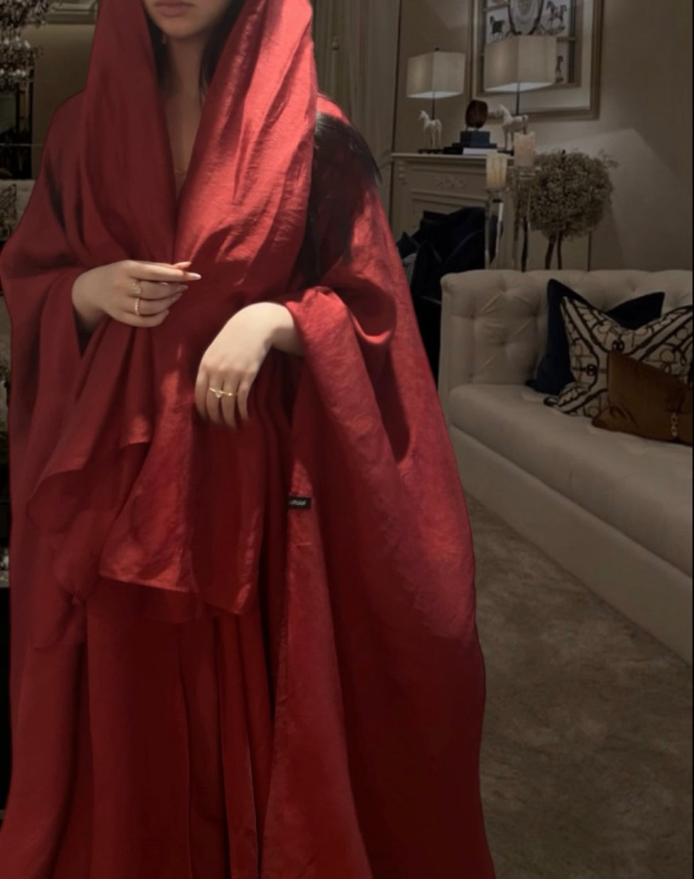 Stunning Double Layered red open abaya with matching scarf. Perfect as a wedding guest dress or for an evening out.